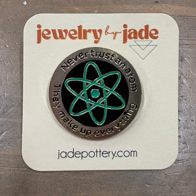 never trust an atom they make up everything enamel pin FREE SHIPPING OVER $45