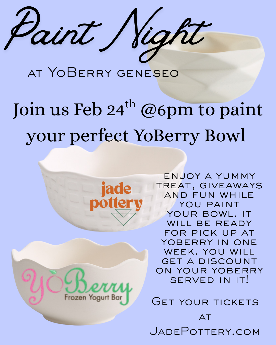 Join us for a creative evening at YoBerry Geneseo on February 24th at 6pm to paint your own ceramic bowl. Whether you're a seasoned artist or picking up a brush for the first time, this hands-on workshop offers the perfect blend of relaxation and artistic expression. Take home a one-of-a-kind piece you've crafted yourself, complete with professional glazing and firing in one week. Ideal for date nights, friend gatherings, or solo creative time. All materials and instruction included—just bring your imagination. Enjoy a Yummy treat while painting. Giveaways and fun! Your piece will be returned to YoBerry in 1 Week to pick up and enjoy a discounted treat in your custom bowl!!