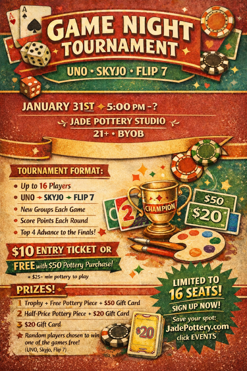 This Game Night Tournament is the first in our brand-new monthly series at Jade Pottery! Whether you’ve played these games a hundred times or have never touched a card deck in your life — don’t worry. We’ll go over all rules before each round, answer questions, and make sure everyone feels confident and ready to play. No experience needed, just good vibes!